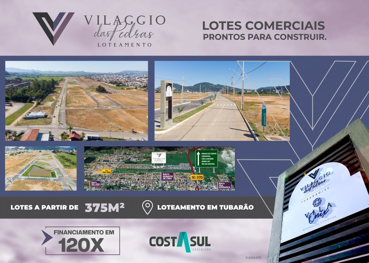 O terreno composto porlotes residenciais, comerciais e empresariais, comunica de forma clara e objetiva o propósito que o produto agregará para a cidade de Tubarão: Duas grandes vilas diferentes, com um único objetivo:CONEXÃO entre os bairros Humaitá de Cima e São João ME.